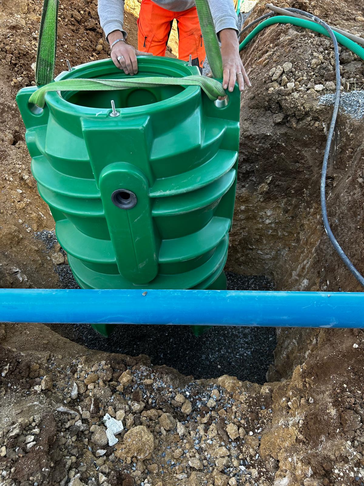Pose d'une micro station avec pompe de relevage, terrassement , excavation, pose d'un radier support , mise en place et connexion.